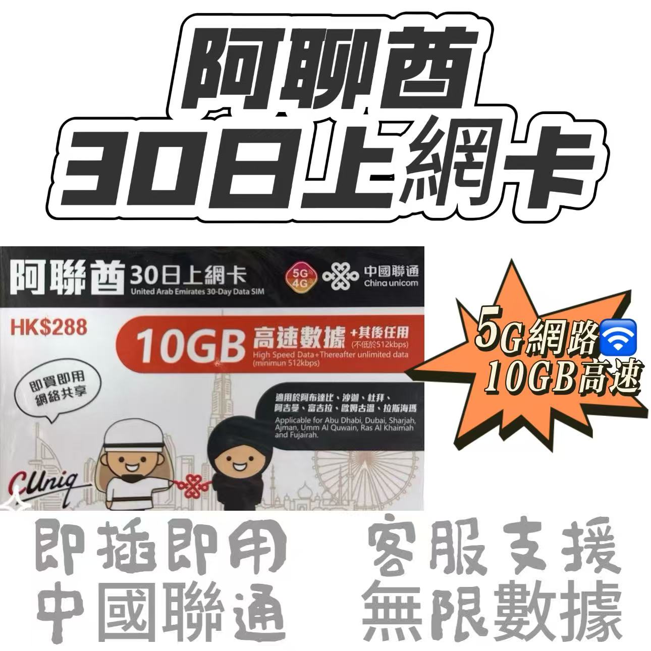 中國聯通 - 阿聯酋/ 杜拜/沙迦【30日 10GB FUP】5G/4G極高速 無限數據卡 上網卡 電話卡 旅行電話咭 Data Sim咭