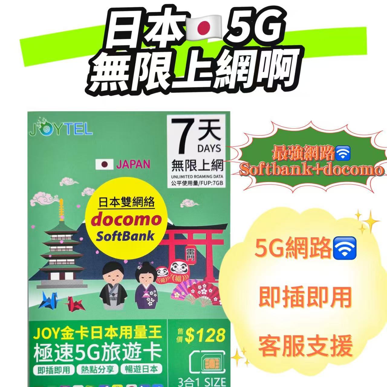 SoftBank - 日本 全網通金卡【7日 7GB FUP】5G 極高速 無限數據卡 上網卡 旅行電話咭 Data Sim咭
