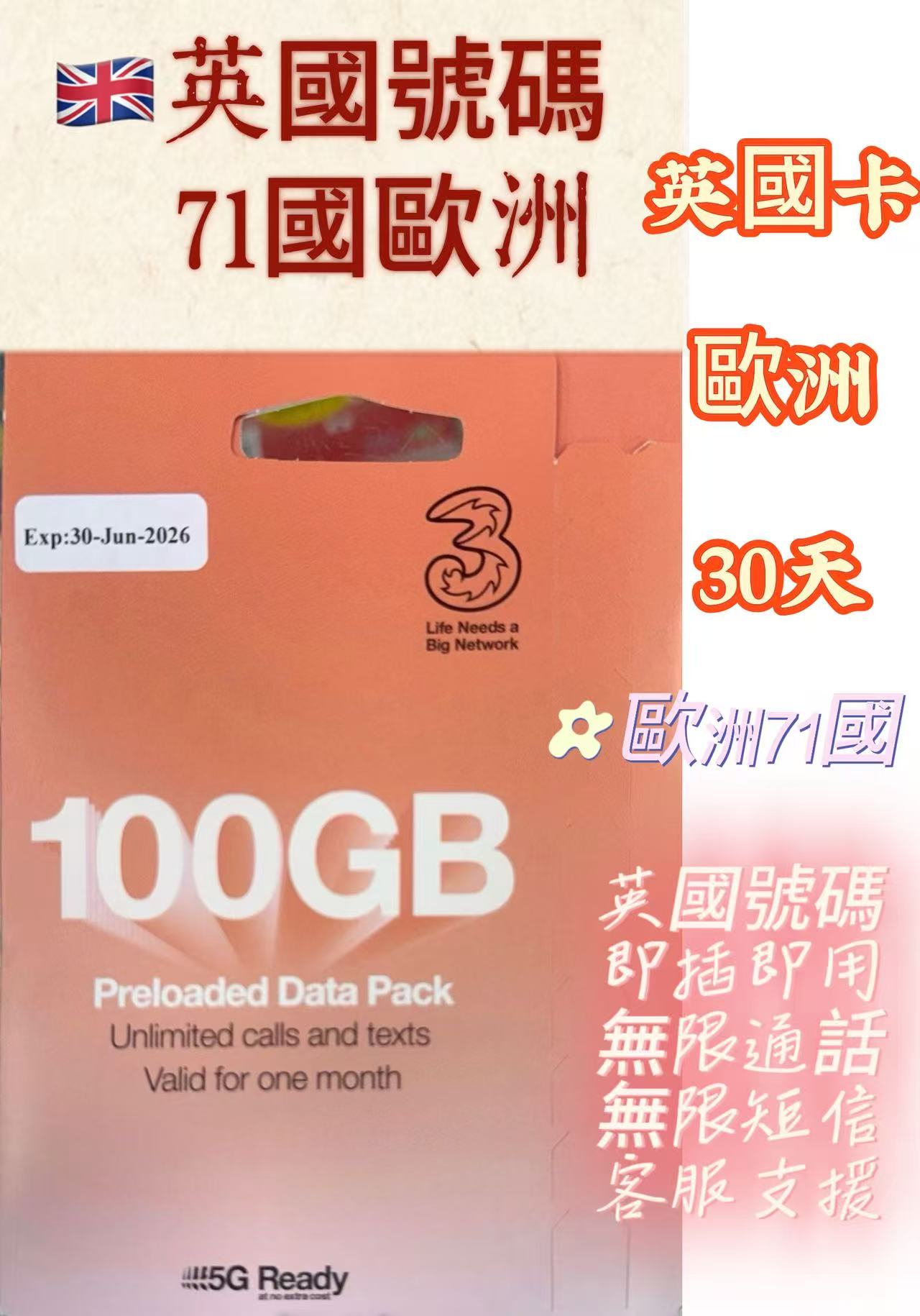 3 (UK) - 英國歐洲71+國 【30日100GB + UK無限通話 | 附英國電話號碼】5G/4G/3G 高速漫遊數據上網卡