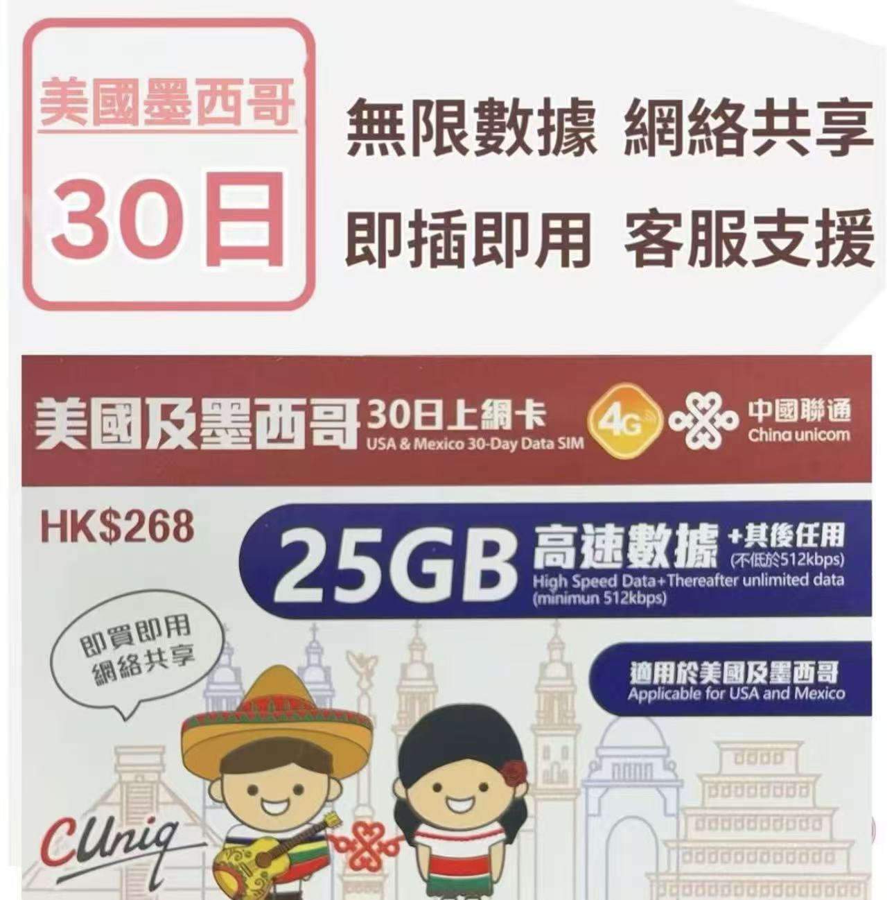 中國聯通 - 美國,及墨西哥 25GB【30日】4G/3G高速無限 數據卡 上網卡 電話卡 旅行電話咭 Data Sim咭