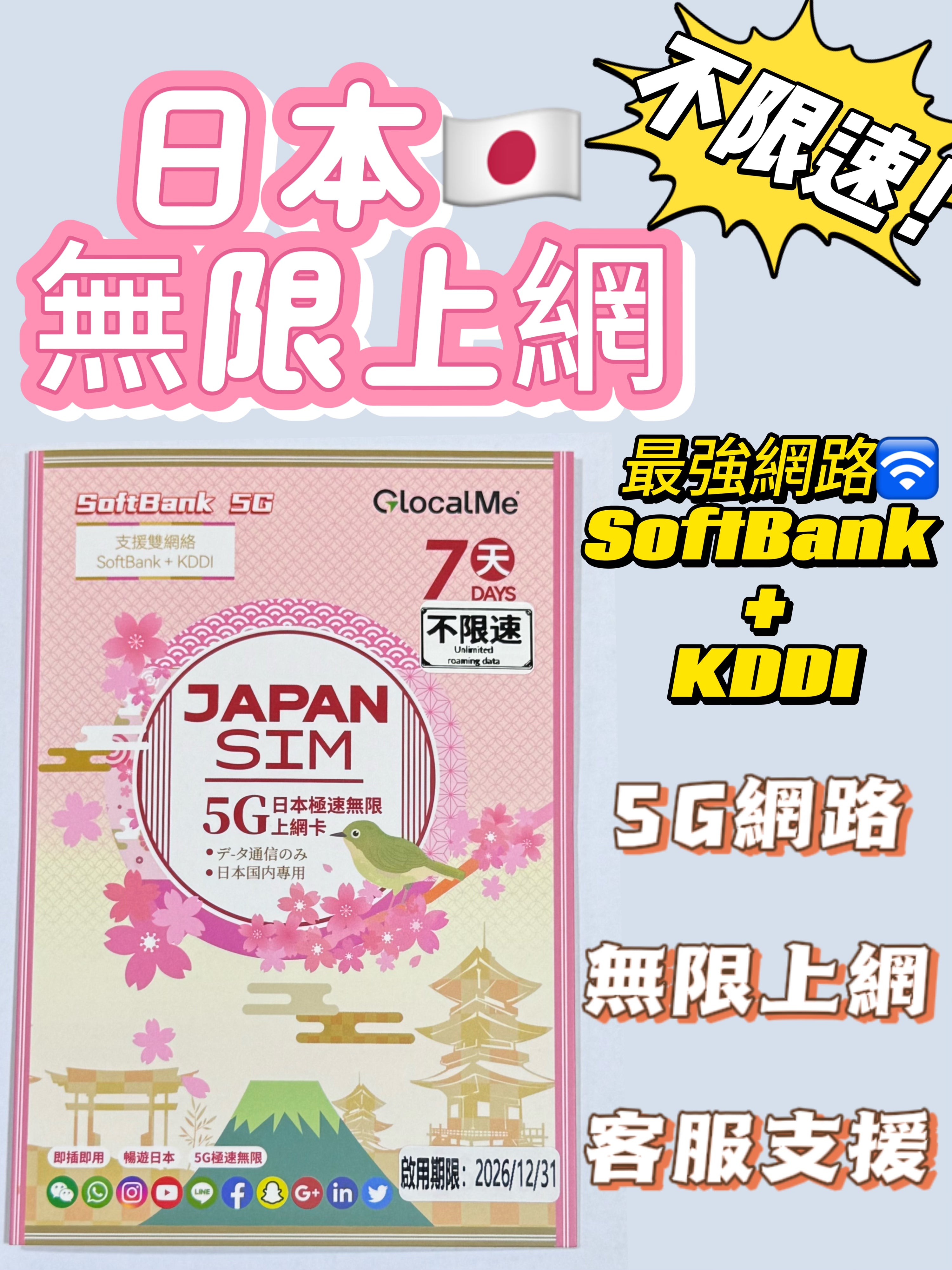 GlocalMe - 日本 真•無限上網【7日全程 5G不限速】雙網絡Softbank+KDDI